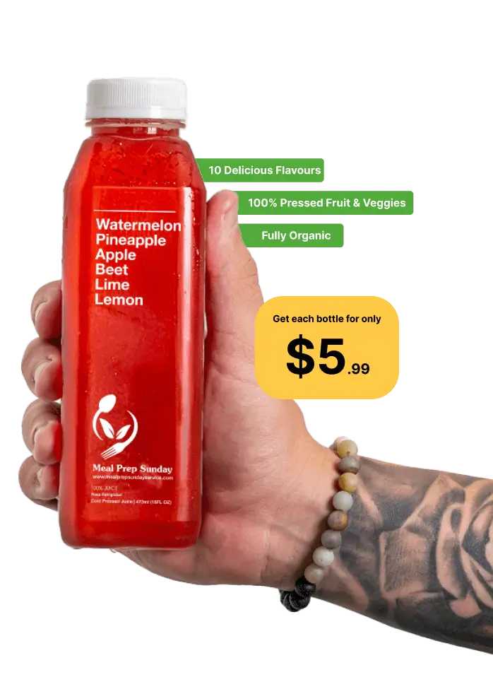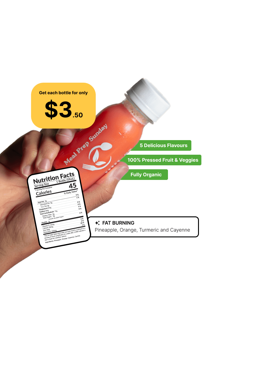 Our 100% organic, nutrient-rich cold-pressed juices complement your meal prep by boosting metabolism, supporting hormone and blood sugar balance, and enhancing protein synthesis. With no additives and 14 delicious flavors, they help your body burn fat efficiently, increase energy, and stay on track—trusted, chef-crafted, and nutritionist-approved.