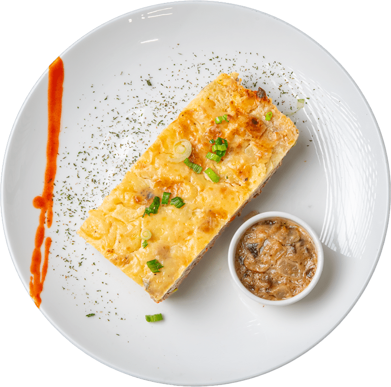 Ground beef, mushrooms, onions, carrots, and peas cooked in a creamy mushroom sauce, then topped with fluffy mashed potatoes and finished with mushroom gravy on the side.