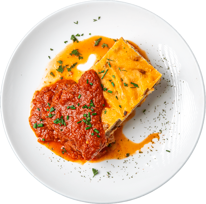 Breakfast Burrito Casserole with Tortilla, Mexican Three-Cheese Blend, Scramble, Hash-Brown and a Chorizo Skillet of Blistered Tomato, Onion & Green Pepper, served with Roasted Red Salsa