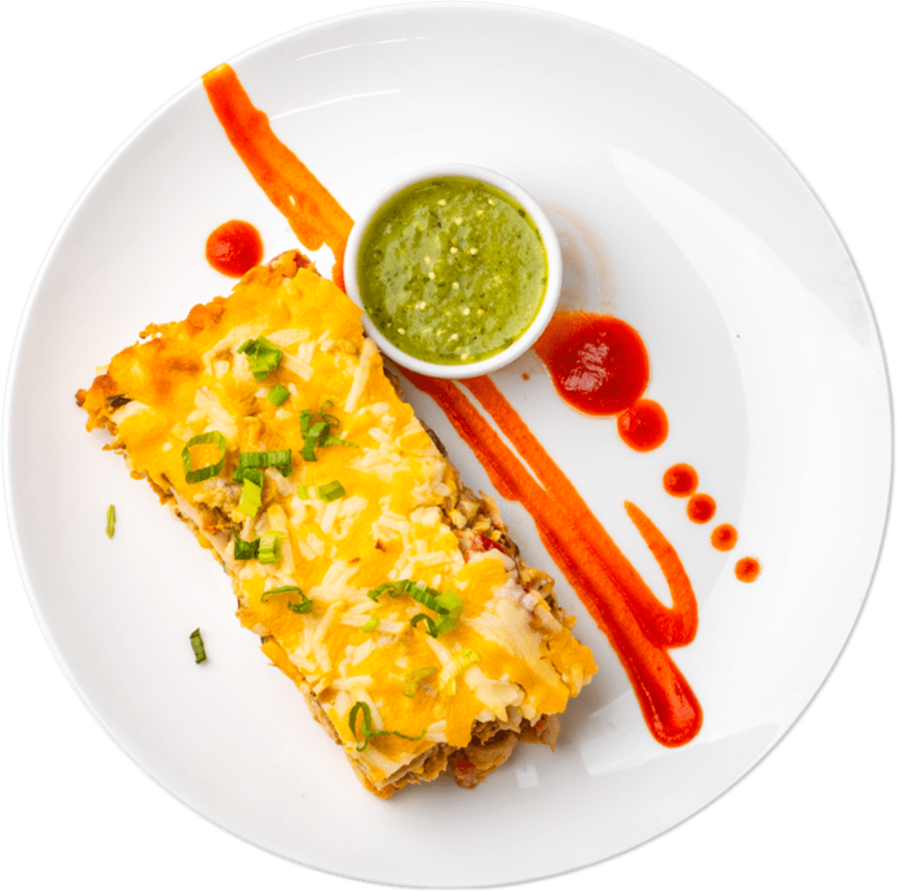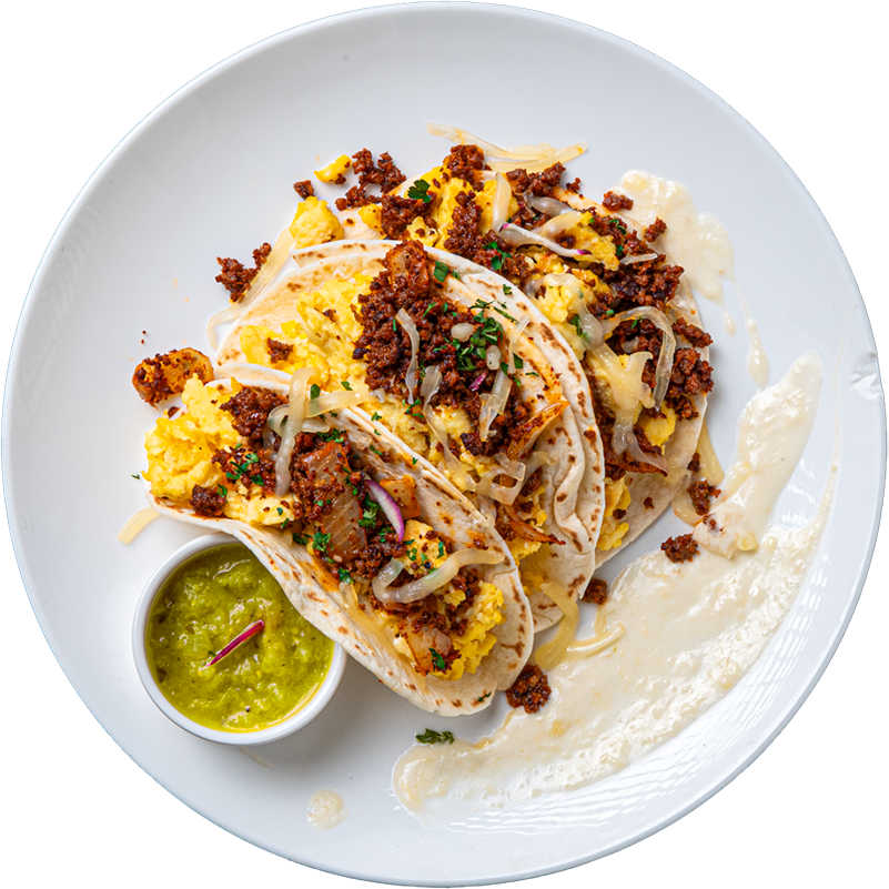 A bold, sweet-savory breakfast plate with a chorizo-loaded tortilla, refried black beans, and a rich sunny-side egg, balanced by smoky chipotle crema and a smooth honey-vanilla cinnamon yogurt.