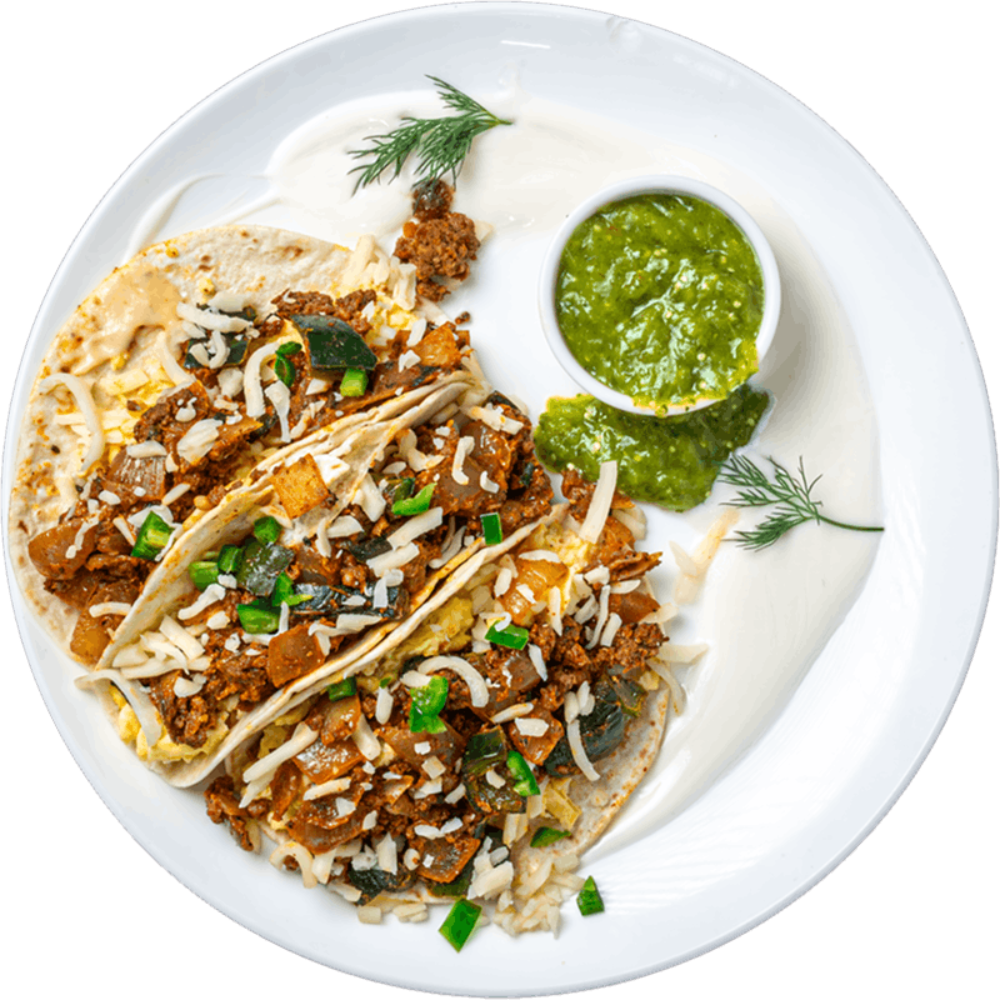 A bold, sweet-savory breakfast taco loaded with smoky chorizo, cheesy eggs, and refried black beans, balanced by creamy avocado tomatillo and a bright pineapple-lime yogurt on the side.