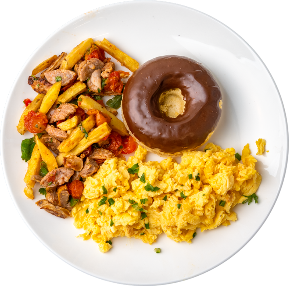 A balanced sweet-savory breakfast featuring a hearty oat protein donut paired with spicy pepper jack egg bites and a smoky Andouille sausage–roasted Yukon potato skillet.