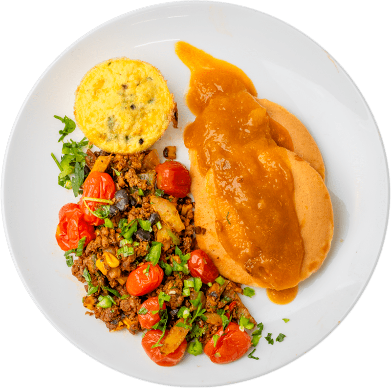 Pancake topped with Vanilla Cottage Cheese Whip, Cheddar Cheese Egg Bites, Brisket Breakfast Skillet, garnished Pineapple Compote and Roasted Coconut.