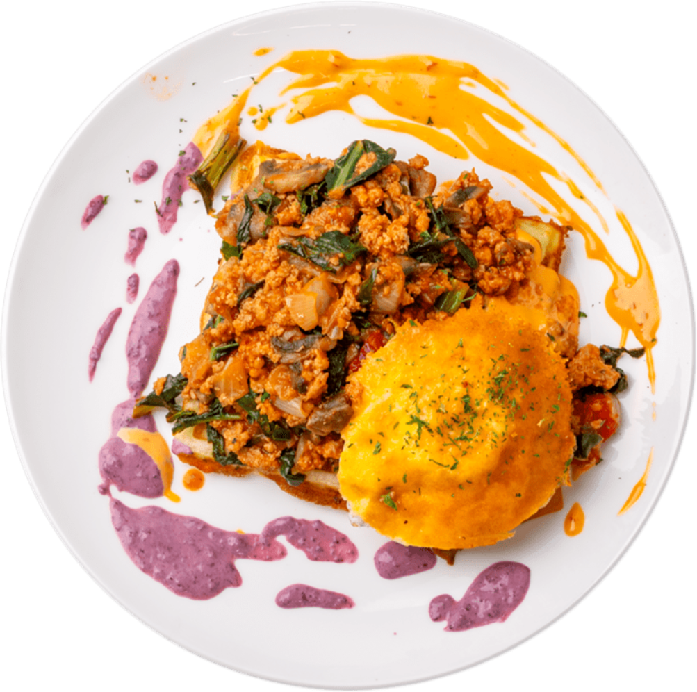 A bold, indulgent breakfast featuring a crispy mashed potato–mozzarella herb waffle topped with spicy Italian sausage ragù and a sunny-side egg, served with Calabrian chili aioli and a refreshing mixed-berries yogurt on the side.