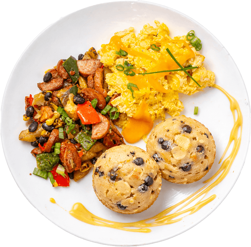 A balanced sweet–savory breakfast with a blueberry banana protein muffin, fluffy cheesy chive scramble, and a bold Andouille sausage skillet for a hearty, satisfying start.