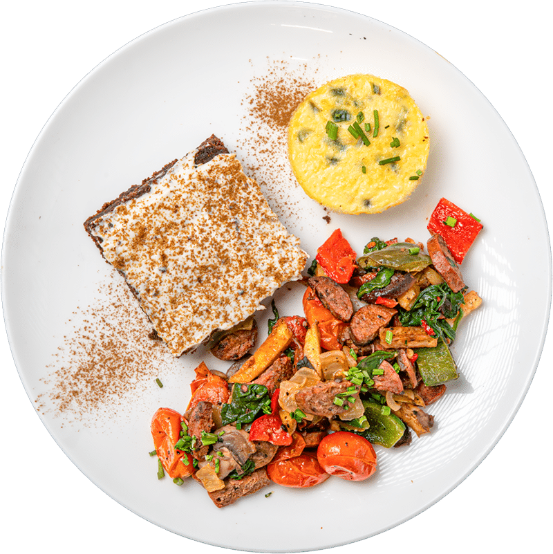 A rich, dessert-like breakfast with intense espresso-frosted protein brownies balanced by smoky bacon-cheddar egg bites and a hearty ground beef hash loaded with cheesy roasted Yukon potatoes and savory veggies.