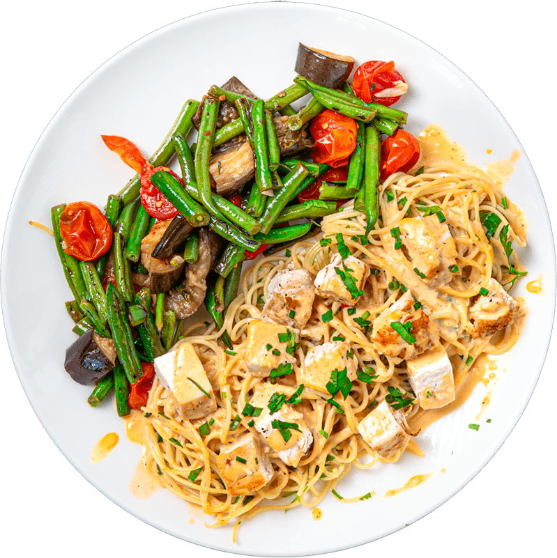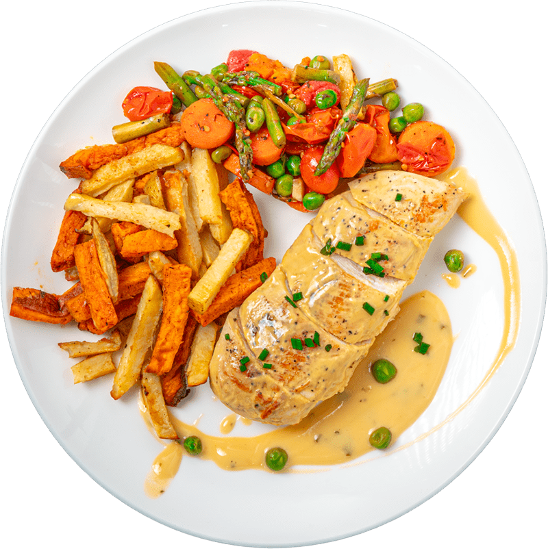A rich and comforting pasta dish with tender chicken and silky carbonara sauce, balanced by roasted veggies and crispy bacon for a savory, indulgent finish.