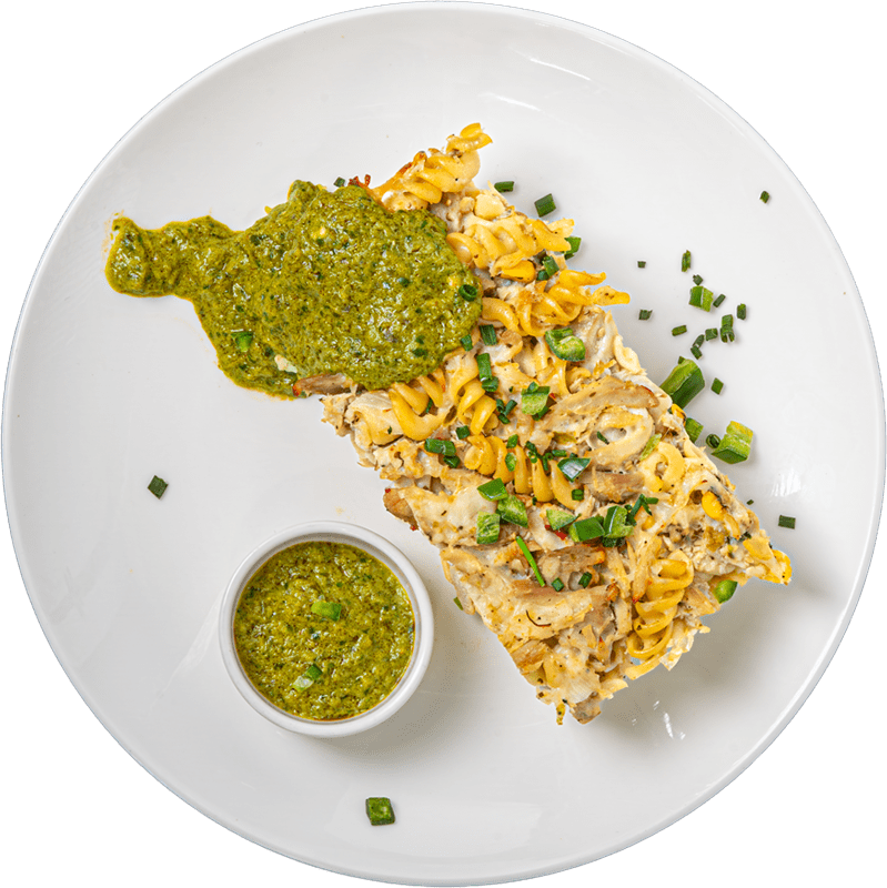 Chicken Poblano Verde Lasagna with Rotini Pasta, Poblano, Onion, Garlic, Jalapeno, Cilantro, Corn, Spinach, Oaxaca, Mozzarella.