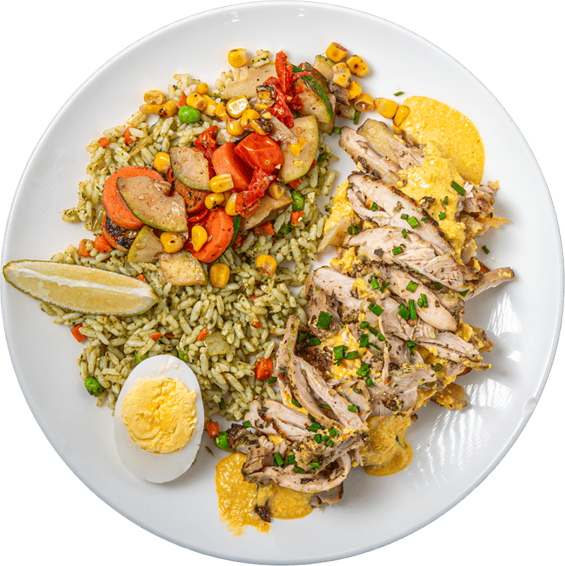 6 Chicken Thigh with Peruvian Green Marinade over Huancaina Sauce, Roasted Potato, Zucchini, Blistered Tomato, Corn, Coin Carrots, served with Half Boiled Egg.
