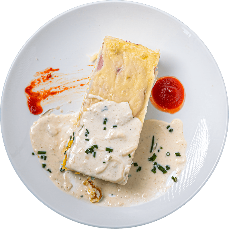 Croque Monsieur Breakfast Pie with Hash Browns, Swiss Cheese, Fried Egg & Ham, served with Cheesy Mornay Sauce.