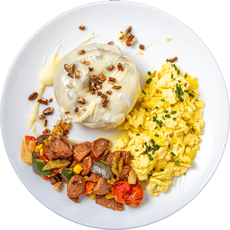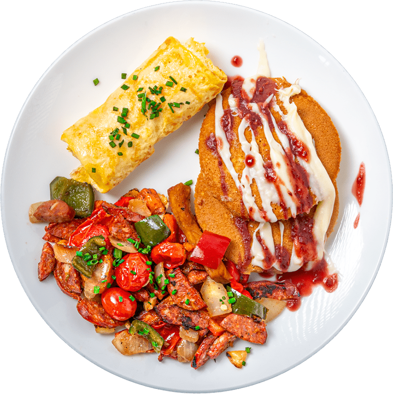 White Chocolate Raspberry Protein Pancakes with Cheddar Omelet, Andouille Sausage and Roasted Yam Skillet with Blistered Tomato, Poblano, Garlic, Onion.