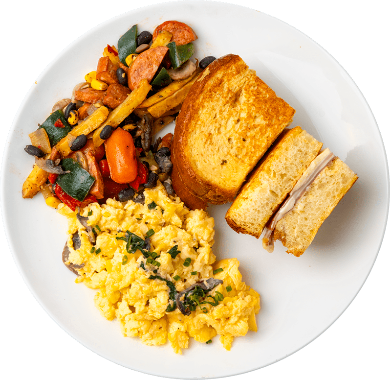 Ham and Cheese Stuffed French Toast with Cheesy Chive Scramble and a Kielbasa Sausage Skillet with Roasted Yukon Potato, Mushroom, Onion, Blistered Tomato.