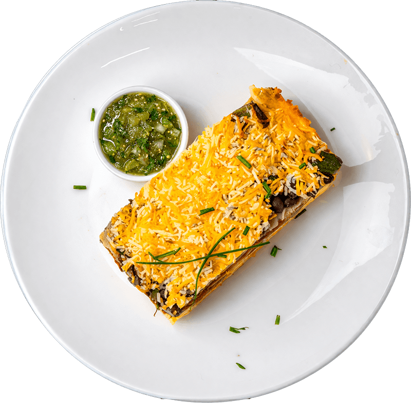 A hearty, cheesy breakfast bake with layers of scrambled eggs, cheddar, and smoky chorizo skillet folded into tortillas, served with bright salsa verde on the side for a fresh, tangy contrast.