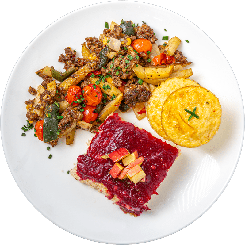 A warm and cozy apple-cinnamon blondie topped with bright cranberry-orange spread, paired with a cheesy egg bite and a hearty cheddar beef–potato skillet full of savory veggies.