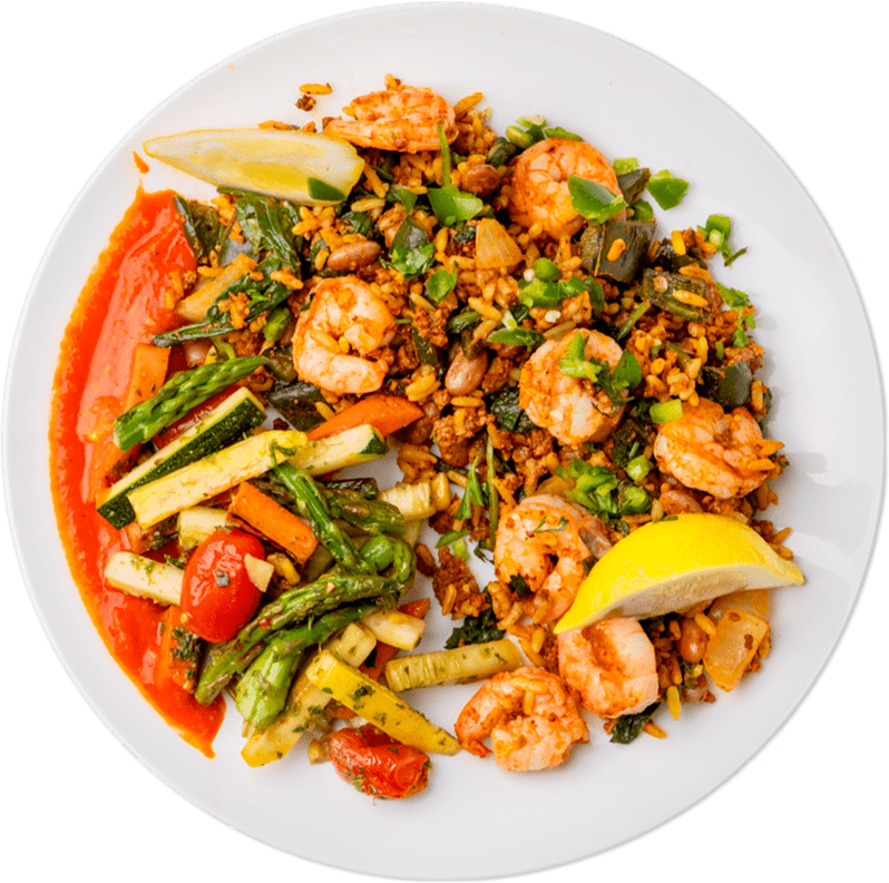 Shrimp Paella with Chorizo, Andouille Sausage, Saffron Rice & Cilantro, served with Zucchini, Yellow Squash, Peas & Blistered Tomato, finished with Alioli Sauce and Lemon