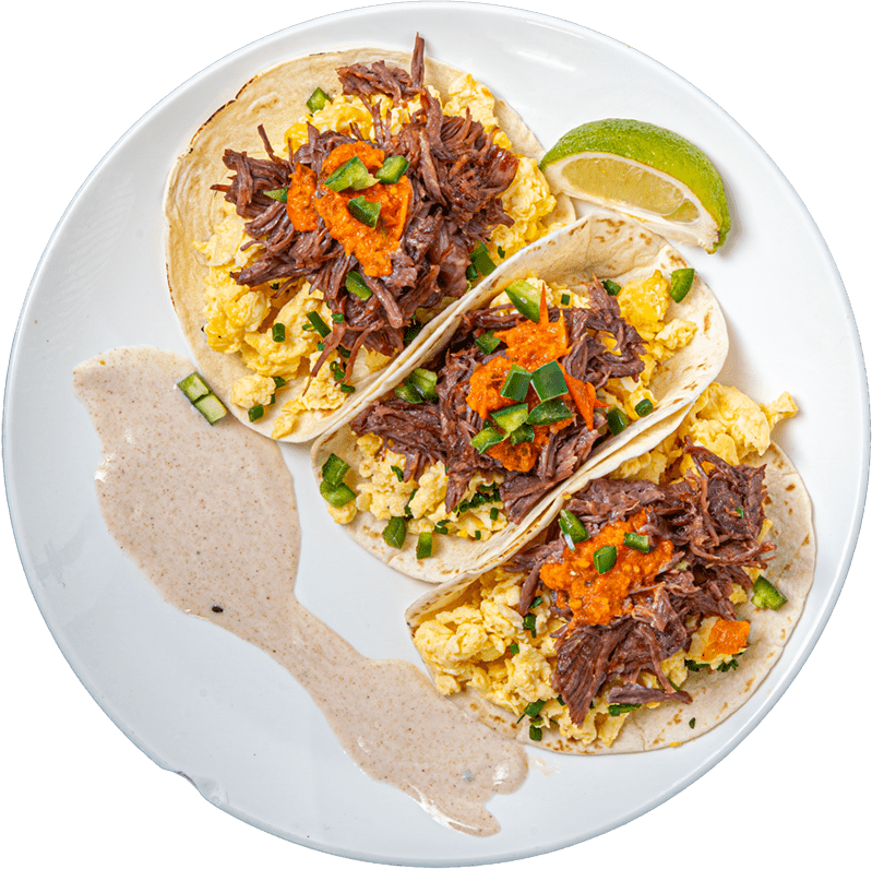 A rich and savory breakfast taco with tender barbacoa and cheesy chive eggs, topped with fresh chunky pico and paired with sweet honey-cinnamon yogurt and a hint of jalapeño heat.