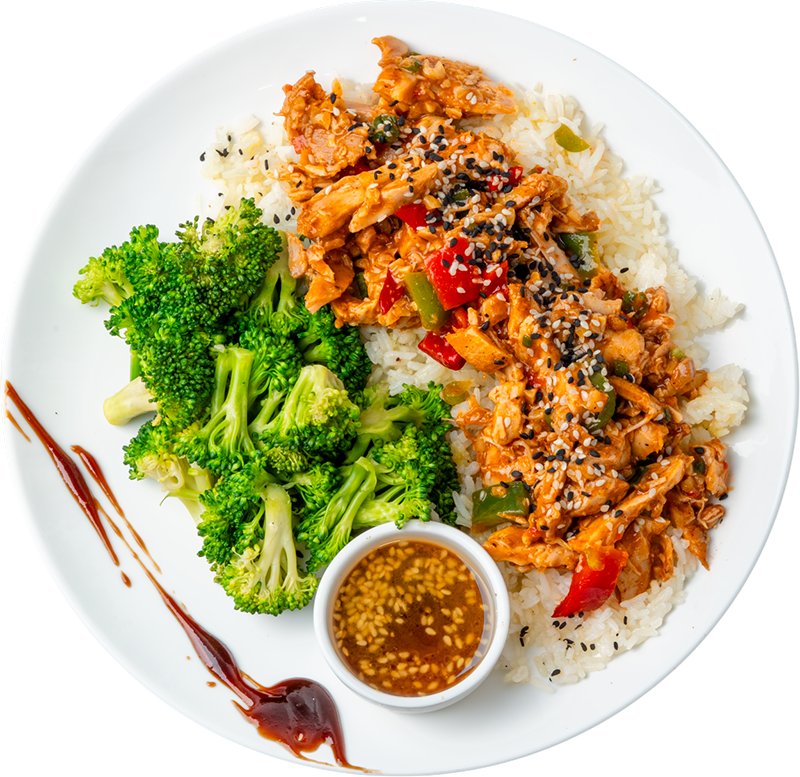 A bold, spicy-sweet Kung Pao dish with tender chicken, crunchy peanuts, and sautéed peppers and onions, served over fragrant cilantro rice with broccoli and finished with glossy sweet soy and nutty sesame.