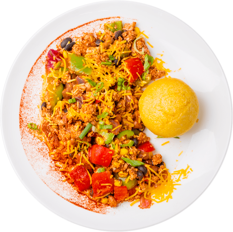 Turkey Three-Bean Chili with Kidney, Black & Pinto Beans, Bell Pepper, Onion, Tomato, Grilled Corn, served with a Cornbread, topped with Sautéed Jalapeño