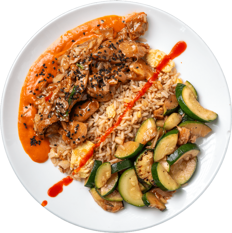 A sweet-spicy fusion dish with bang bang chicken simmered in pineapple teriyaki, served with bold sambal-ginger fried rice and sesame-soy zucchini, all finished with a creamy pineapple-gochujang drizzle and black sesame.
