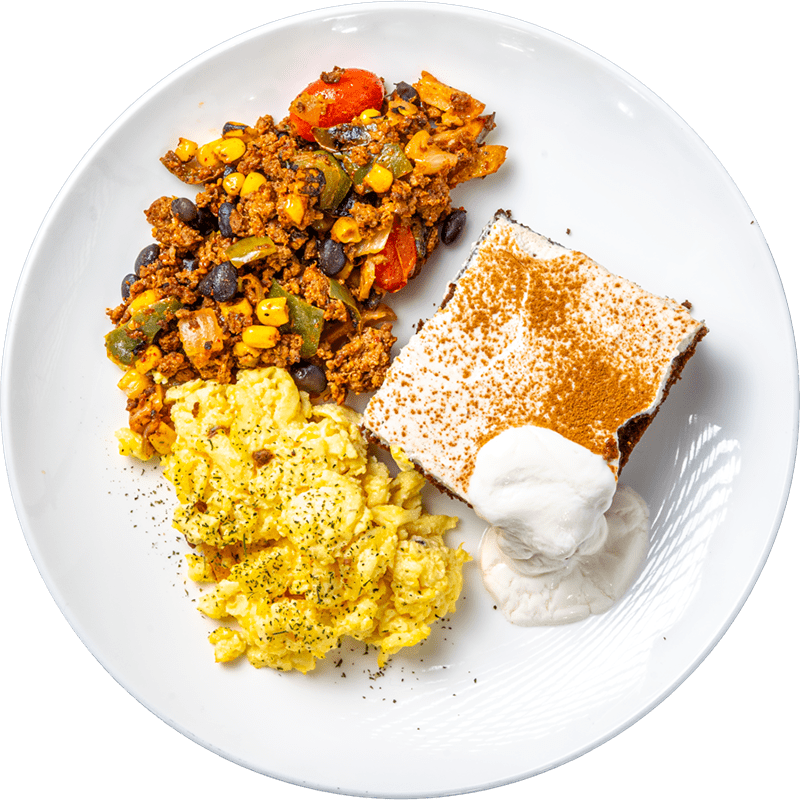 A bold sweet-savory combo featuring spiced Mexican brownies, fluffy cheesy chive eggs, and a smoky chorizo–black bean skillet loaded with roasted potatoes, corn, and blistered veggies.