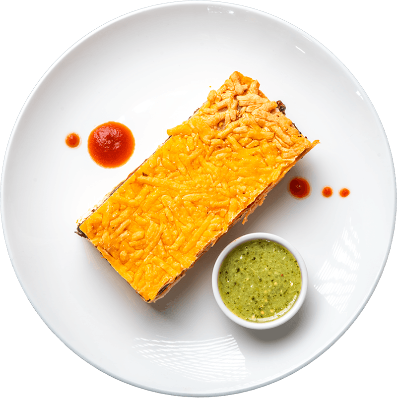 A hearty, cheesy breakfast bake with layers of scrambled eggs, cheddar, and smoky chorizo skillet folded into tortillas, served with bright salsa verde on the side for a fresh, tangy contrast.
