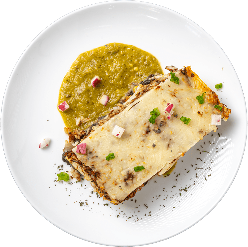 A bright and savory dish with tender salsa verde–shredded pork over smoky fire-roasted poblano sauce, paired with cilantro Spanish rice and vibrant roasted veggies, finished with crisp, fresh radish.