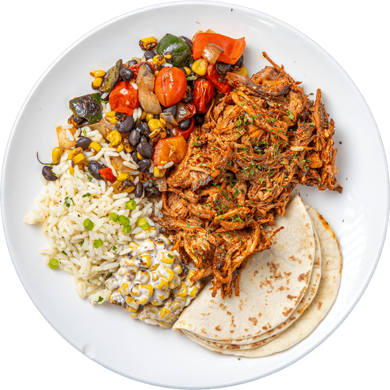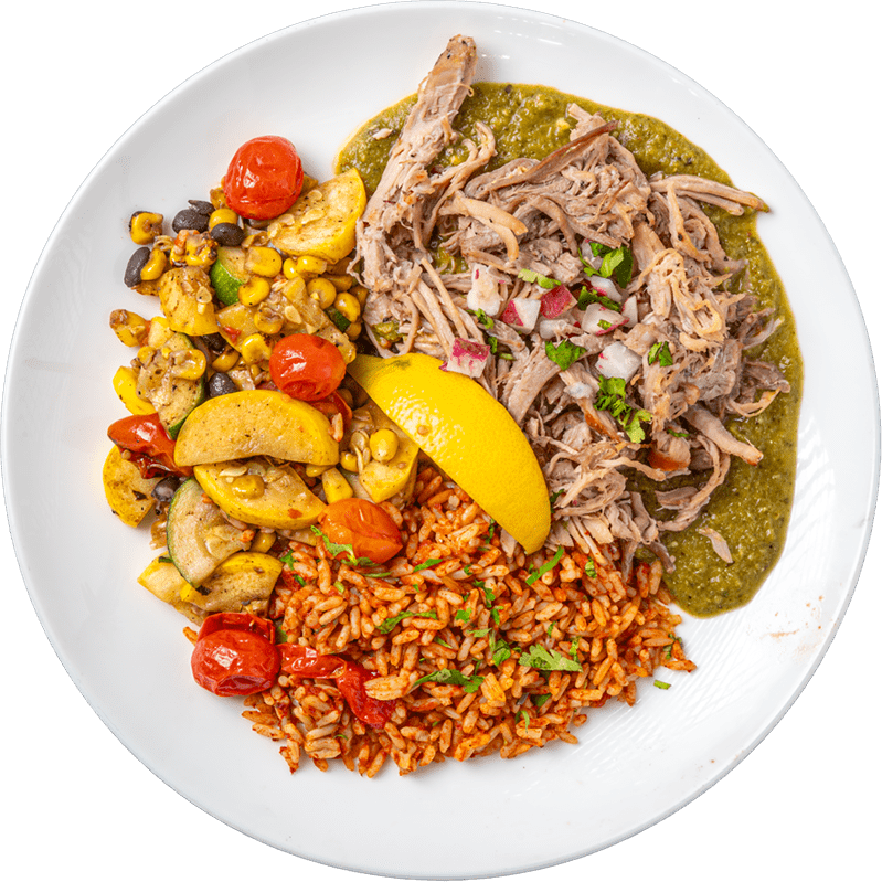 Salsa Verde Shredded Pork over a Bed of Fire-Roasted Poblano Verde Sauce with Spanish Cilantro Rice, Roasted Corn, Black Bean.