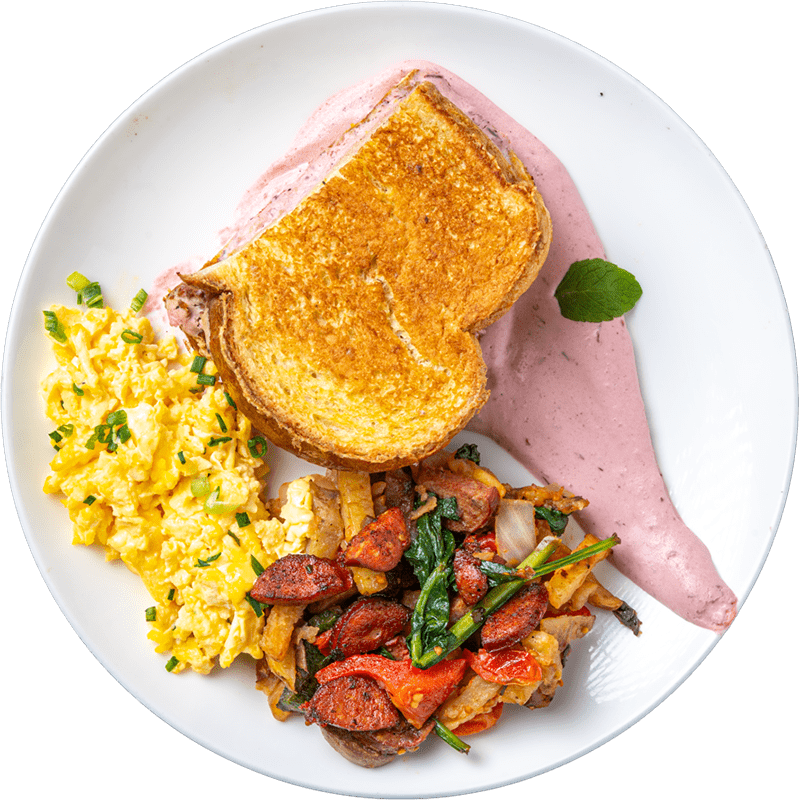 Cream Cheese Cranberry Brioche French Toast with Cheesy Chive Scramble and a Brisket Sausage–Yukon Potato–Poblano