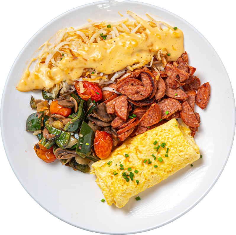 Seared Brisket Sausage, Swiss Cheese Omelet, Sautéed Hash Browns, Sautéed Vegetables with Mushroom, Onion, Poblano, Blistered Tomato garnished with Queso Sauce.