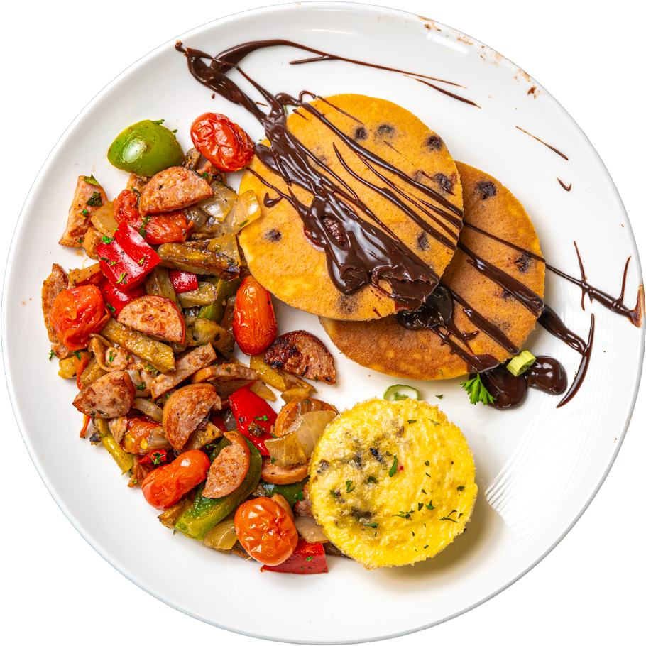 Chocolate Chip Pancake garnished with Chocolate Ganache, Pepper Jack and Jalapeño Egg Bites, Breakfast Beef and Mushroom Hash with Poblano, Roasted Yukon Potato, Sautéed Onions, Shallots, Cheddar Cheese and Green Onions.