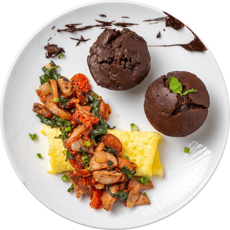 Double Chocolate Protein Muffin served with a Three-Cheese Herb Omelet — Cheddar, Monterey Jack & Parmesan with Chives.