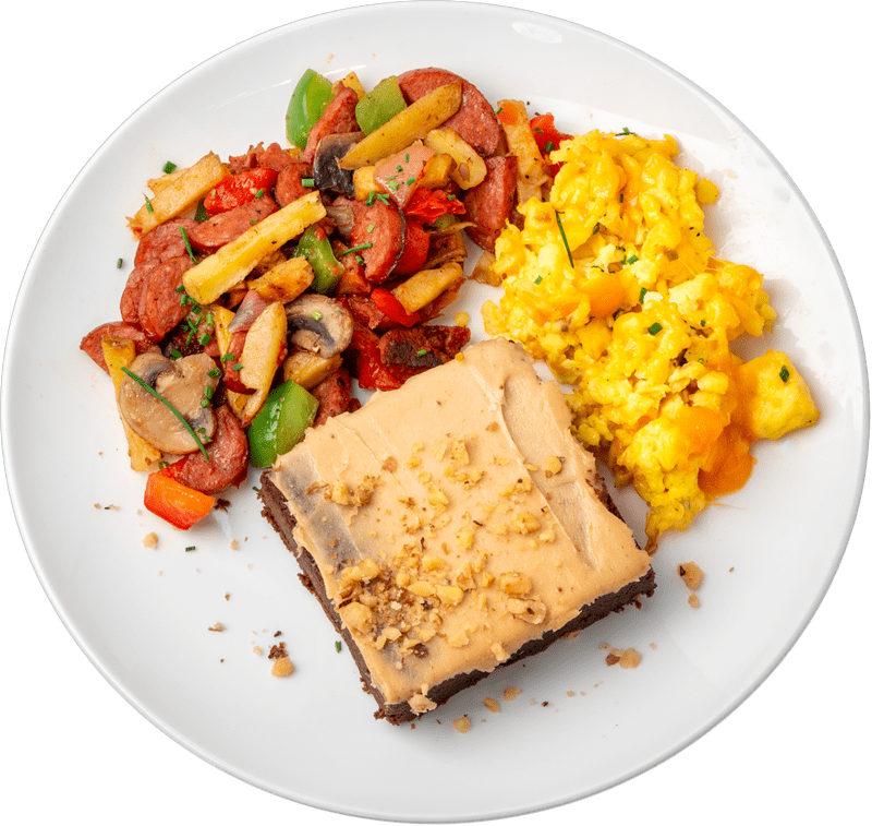 A rich and comforting combo featuring a peanut butter–topped protein brownie, fluffy cheesy eggs, and a smoky Andouille potato skillet loaded with savory veggies.