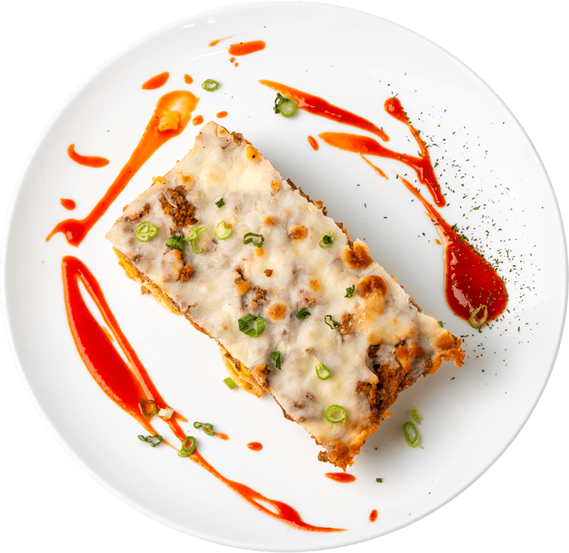 Supreme Pizza Strata with Italian Turkey Sausage Links, Pepper, Mushroom, Black Olives, Spinach, Onion, Marinara Sauce, Mozzarella Cheese and White Bread, served with Pesto Sauce