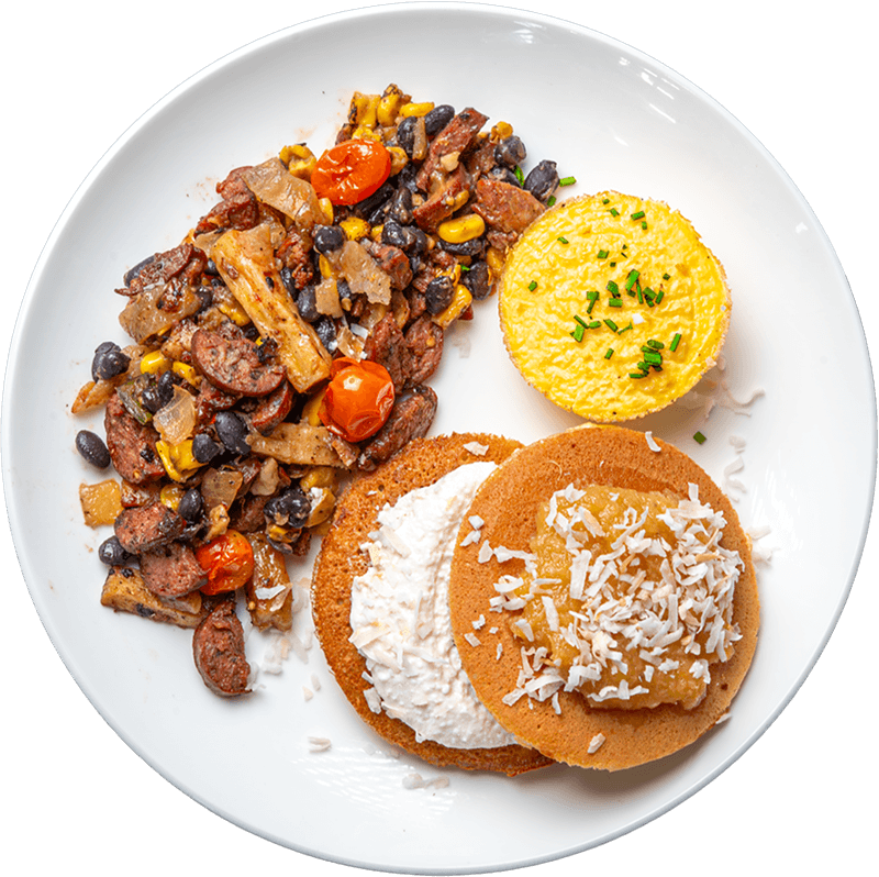 Pancake topped with Vanilla Cottage Cheese Whip, Cheddar Cheese Egg Bites, Brisket Breakfast Skillet, garnished Pineapple Compote and Roasted Coconut.