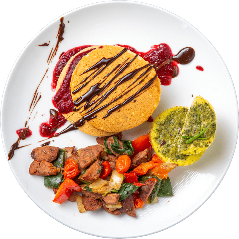 Chocolate Ganache & Cranberry Compote Pancakes with Pesto–Mozzarella Egg Bites and a Andouille Sausage.
