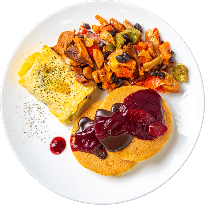 Chocolate Protein Pancakes topped with Cranberry Orange Compote and Chocolate Ganache, served with a Cheesy Omelet and a Linguica Sausage and Black Bean Breakfast Skillet with Onion, Pepper, Roasted Yam and Blistered Tomato.