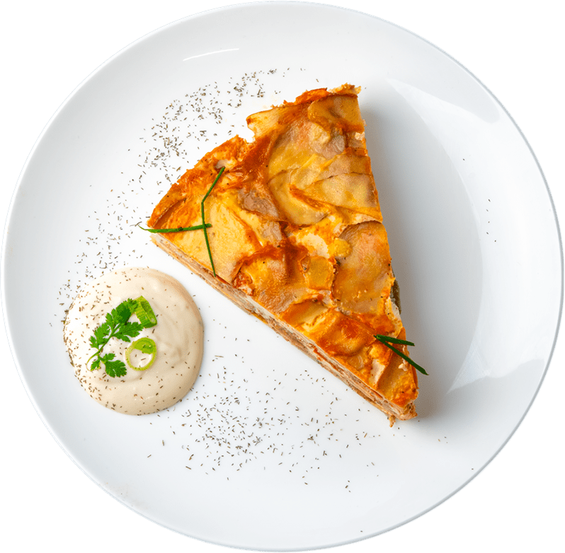 Hash Browns, Cheddar Cheese, Scramble Egg, Bacon, Blistered Tomato, Onion, Pepper, Parsley, Served with Three-Cheese Blend Sauce on the side.