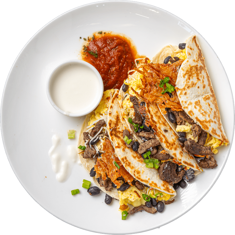 A hearty Southwestern breakfast taco with cheesy eggs, tender steak, and black beans wrapped in a warm tortilla, finished with bold ranchero sauce, pepper jack, and sweet vanilla honey yogurt on the side.