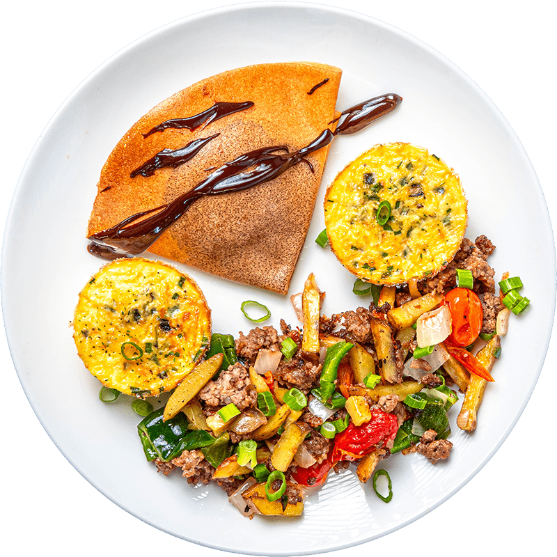 A sweet and savory combo with a creamy banana peanut butter crepe paired with cheesy jalapeño egg bites and a hearty cheddar beef and potato hash for a balanced, comforting breakfast.