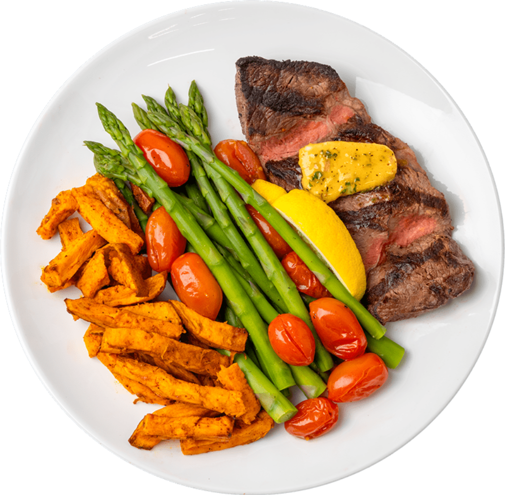 Grilled Cajun Steak, Roasted Yam, Grilled Asparagus and Blistered Tomato Skillet, served with Garlic Butter on the side with a wedge of Lemon.